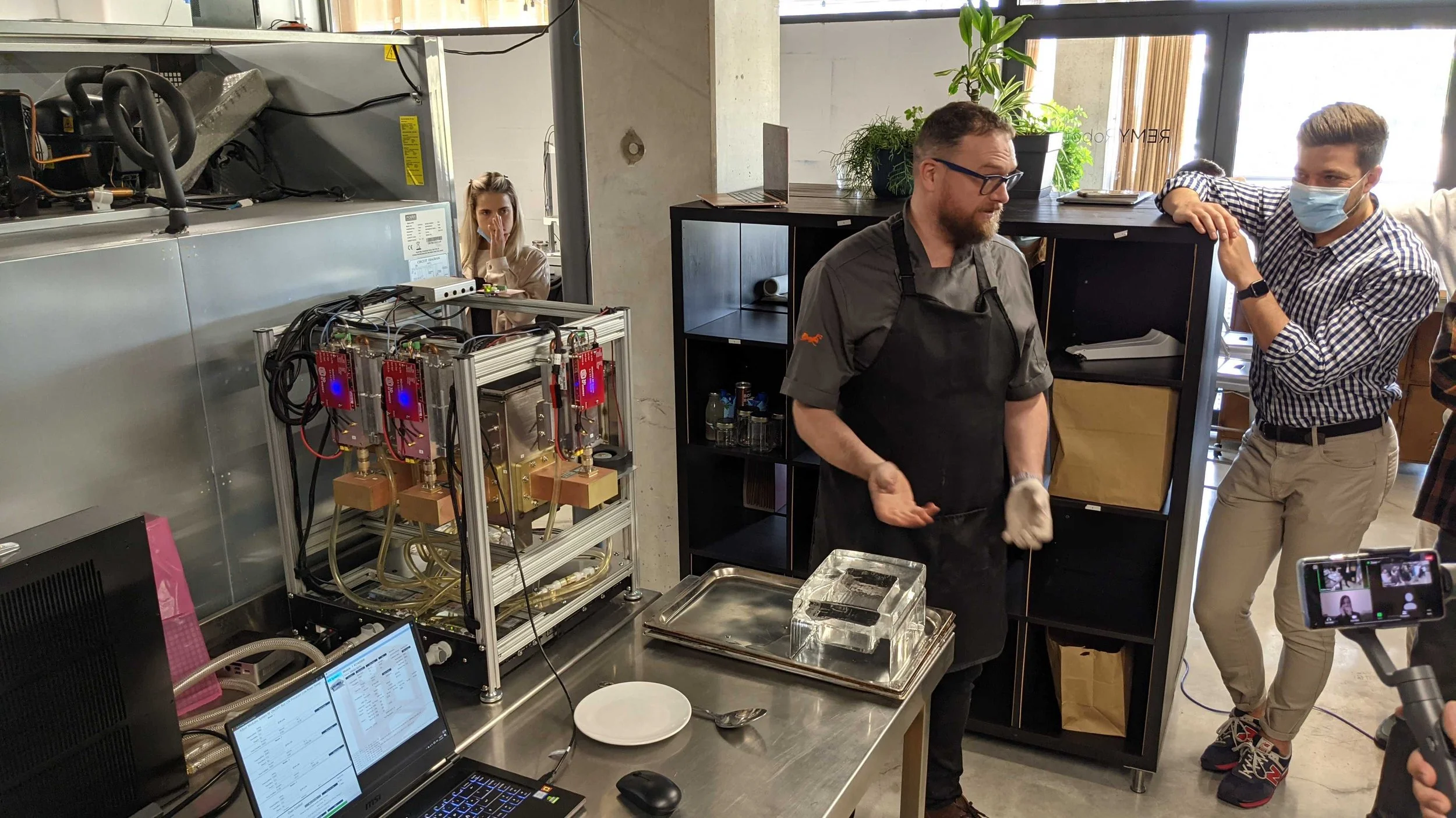 Radio Frequency, Solid State oven for cooking, with feedback. Developed algorithms for food detection, cooking detection, and a method for calibrating the output and field.